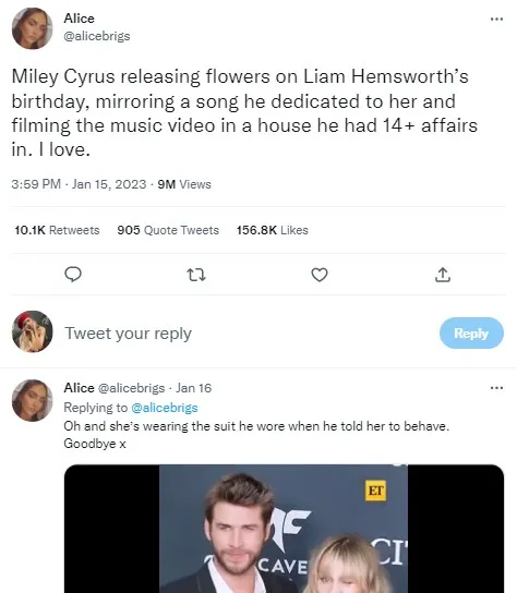 Sebuat cuitan di Twitter milik akun @alicebrigs mengklaim kalau Flowers adalah sindiran buat Liam Hemsworth bahkan dirilis di hari ulang tahun adiik Chris Hemsworth tersebut.