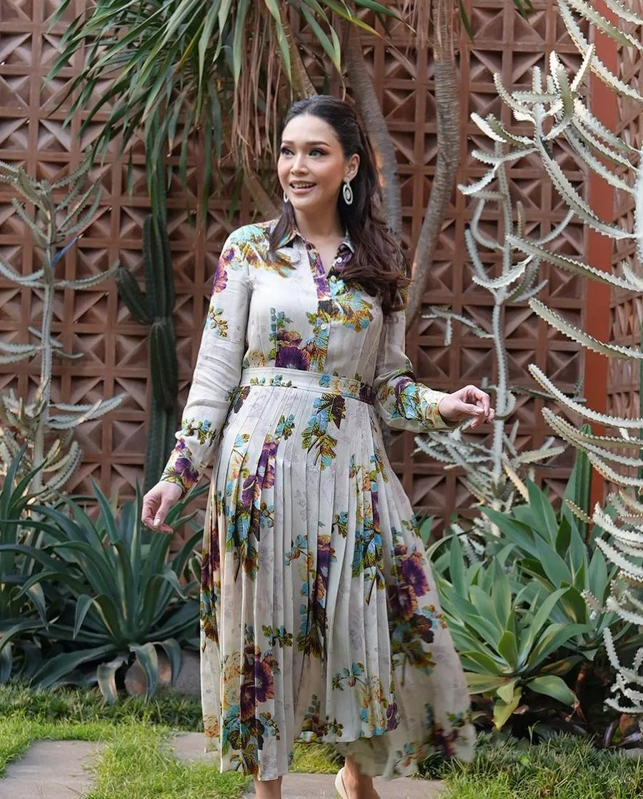Dress cantik yang ia kenakan ini merupakan dari brand ternama Tory Burch dari ritel Time International yang mana CEOnya merupakan suaminya sendiri yakni Irwan Mussry.