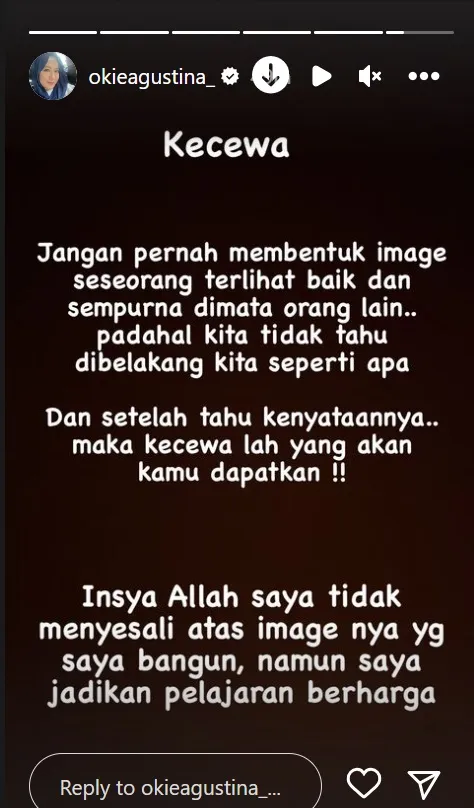 Tak berselang lama, Okie seolah merespon kabar tersebut dengan beberapa unggahan di Ig Story-nya. Dirinya menyinggung soal kekecewaan.