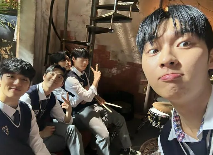 Bersama anaknya dari masa depan, ia pun membangun sebuah band. Begini potret Choi Hyun Wook saat bersama teman-teman bandnya di drakor TWINKLING WATERMELON.