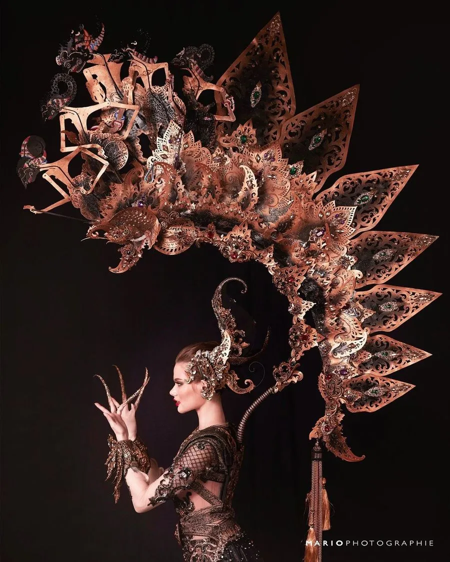 Ini adalah salah satu potret memukau Fabienne ketika mengenakan kostum bernama Ratu Luhur. Fabienne menyebut kostum ini mengandung makna sebagai representasi wanita Indonesia.
