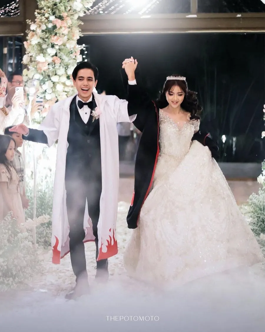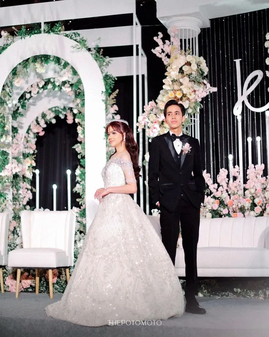 Saat resepsi, Kayes tampil menawan mengenakan gaun berwarna putih yang tampak mewah dengan mahkota kecil di kepalanya, sedangkan Celiboy mengenakan setelan jas berwarna hitam dengan dasi kupu-kupu.