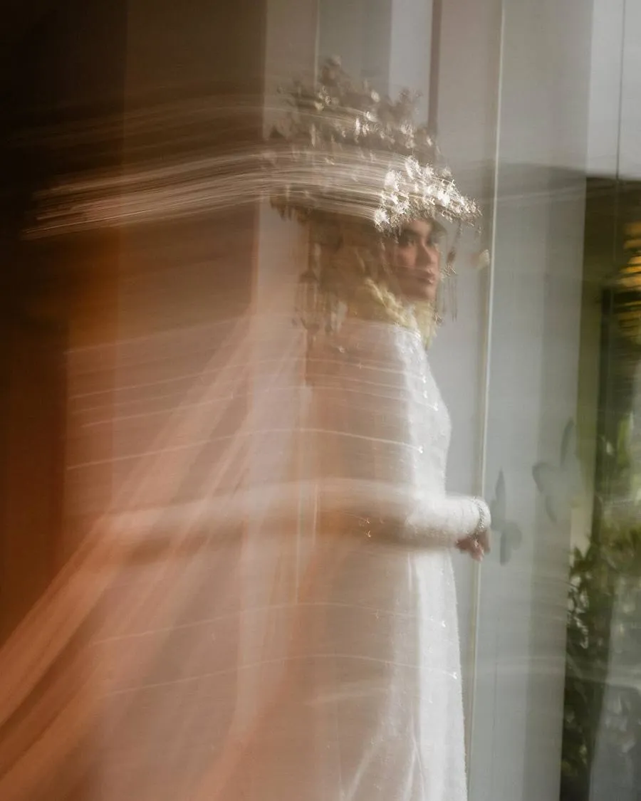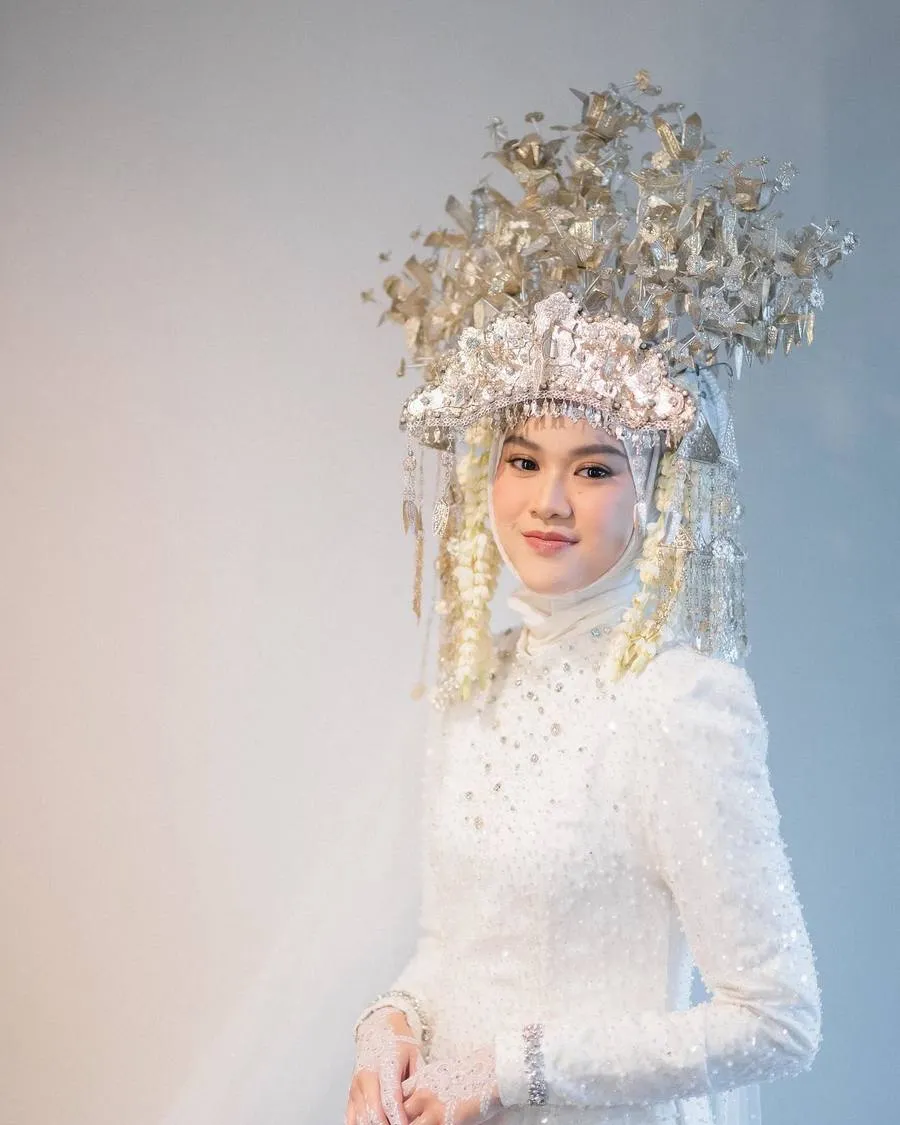 Busana bernuansa putih yang melambangkan kesucian pernikahan dan suntiang yang menghiasi kepala membuat aura pengantin Uty Bonita makin terpancar.