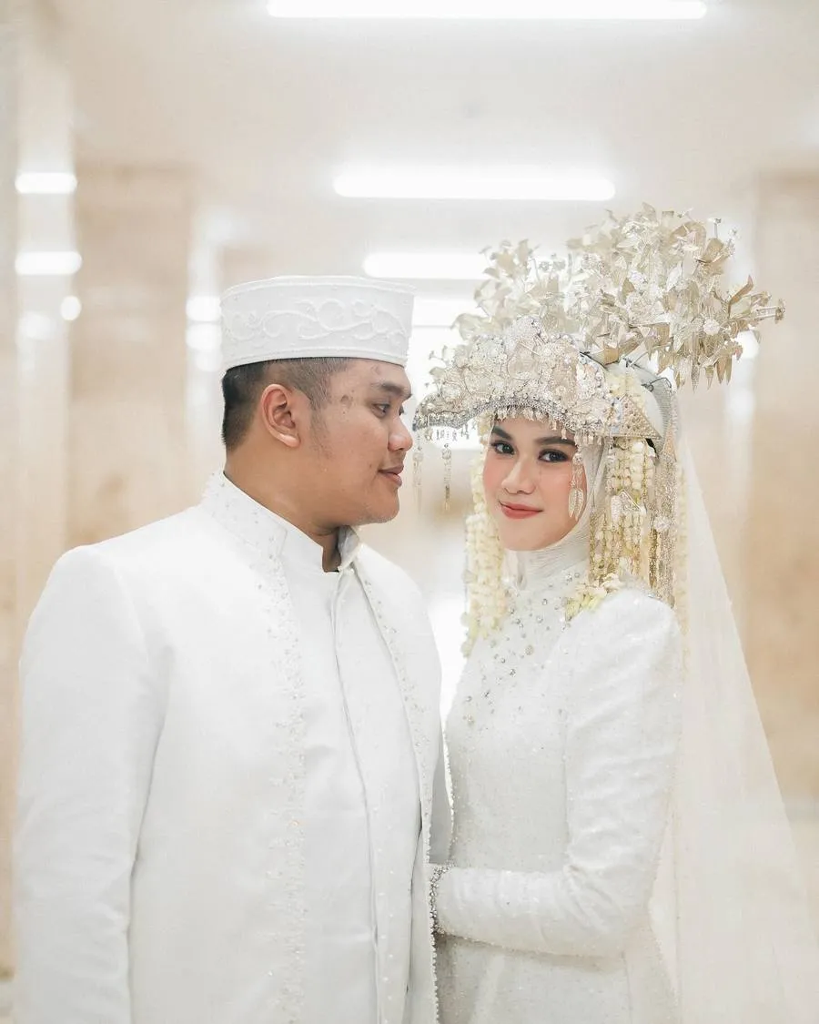 Sang mempelai pria juga mengenakan busana serba putih lengkap dengan songkok dan kalung roncean melati. Keduanya tampak serasi saat bersama.