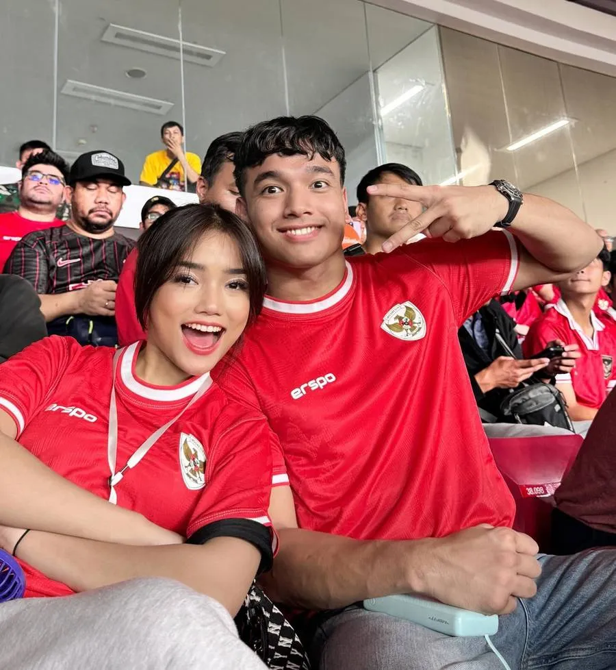 Pasangan kesayangan publik, Lesti dan Rizky Billar, menonton pertandingan Timnas Indonesia dengan mengajak serta putra semata wayang mereka, Levian.