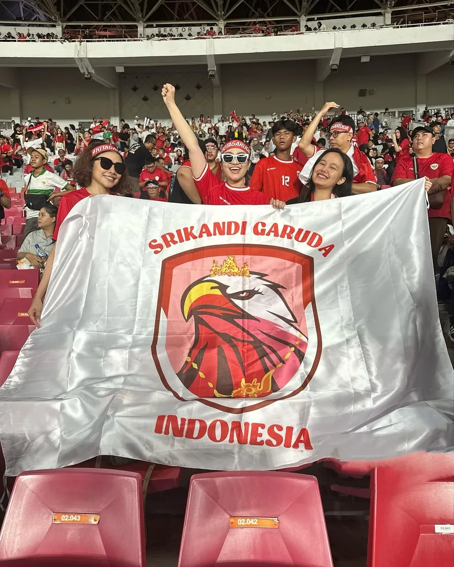 Fitri Carlina begitu bersemangat mendukung Timnas Indonesia bersama supporter-supporter perempuan yang tergabung dalam Srikandi Garuda Indonesia.