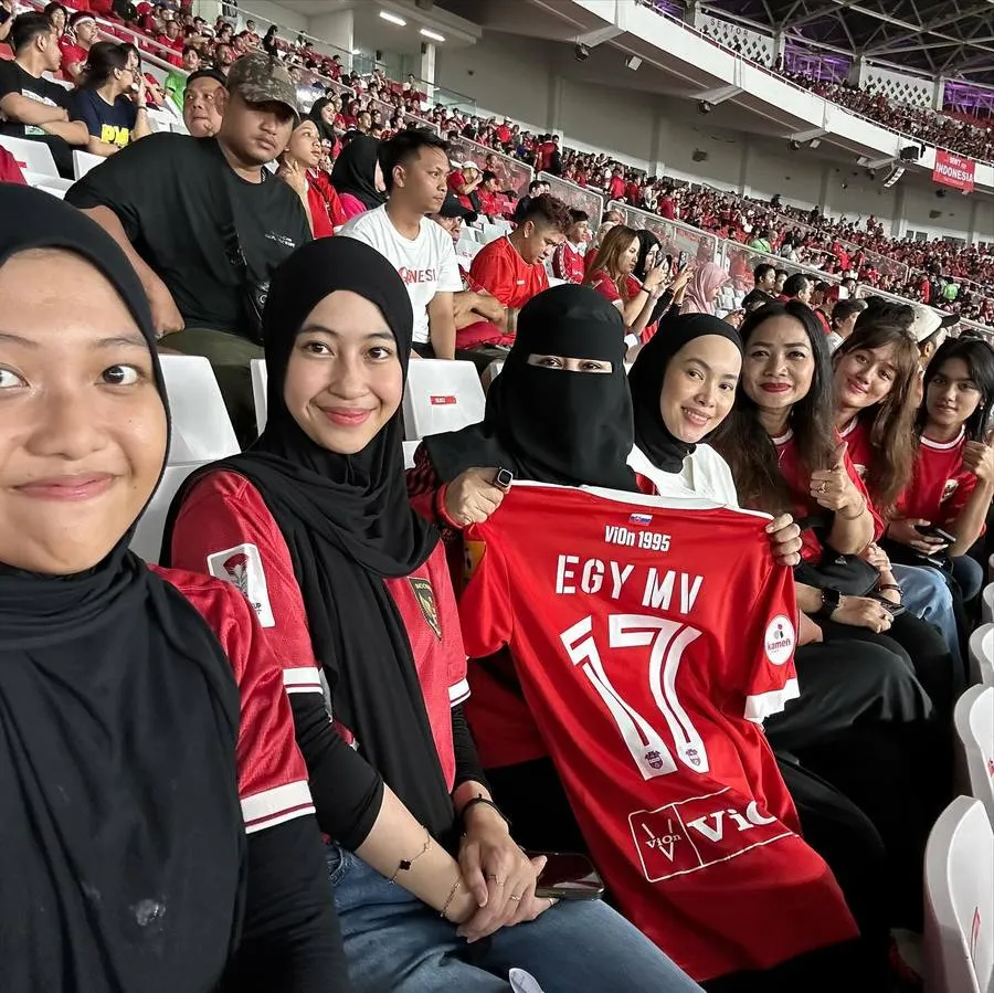 Umi Pipik mendampingi Adiba Khanza mendukung sang suami tercinta, Egy Maulana, yang berlaga di lapangan hijau bersama pemain-pemain Timnas Indonesia lainnya.