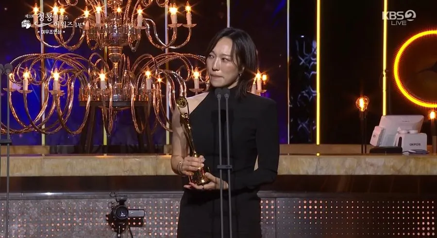 Geum Hae Na tak kuasa menahan rasa harunya ketika menerima penghargaan Best Supporting Actress berkat drama A SHOP FOR KILLERS.