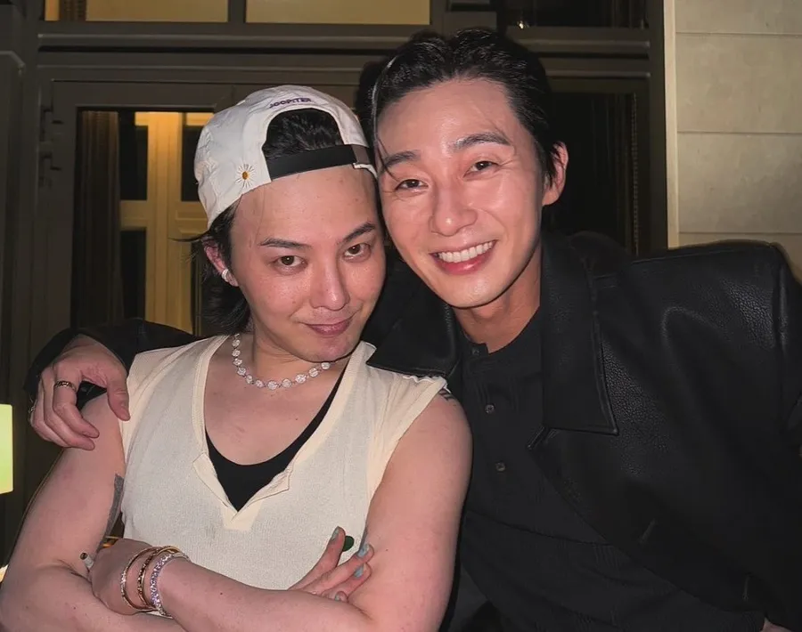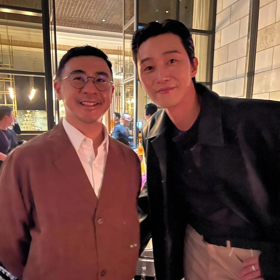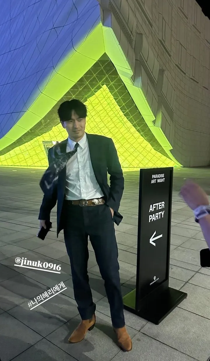Untuk tamu undangan yang hadir, ada Park Seo Joon yang tampil stylish mengenakan jaket kulit, menambah kesan maskulin pada penampilannya.