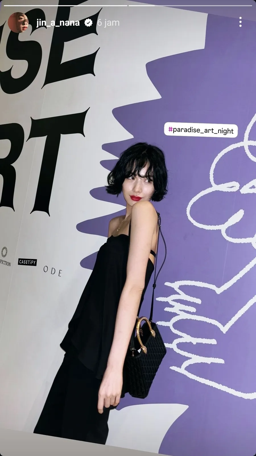 Nana eks After School menawan dengan rambut pendek dan lipstick merah merona, menciptakan penampilan yang berani dan elegan.