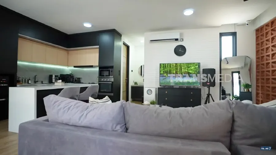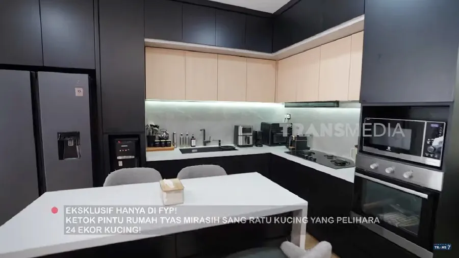 Tepat di samping ruang tengah ada dapur. Dapur Tyas tampak rapi dan estetik dengan dominasi warna hitam. Ada oven hingga kulkas 2 pintu di sana.