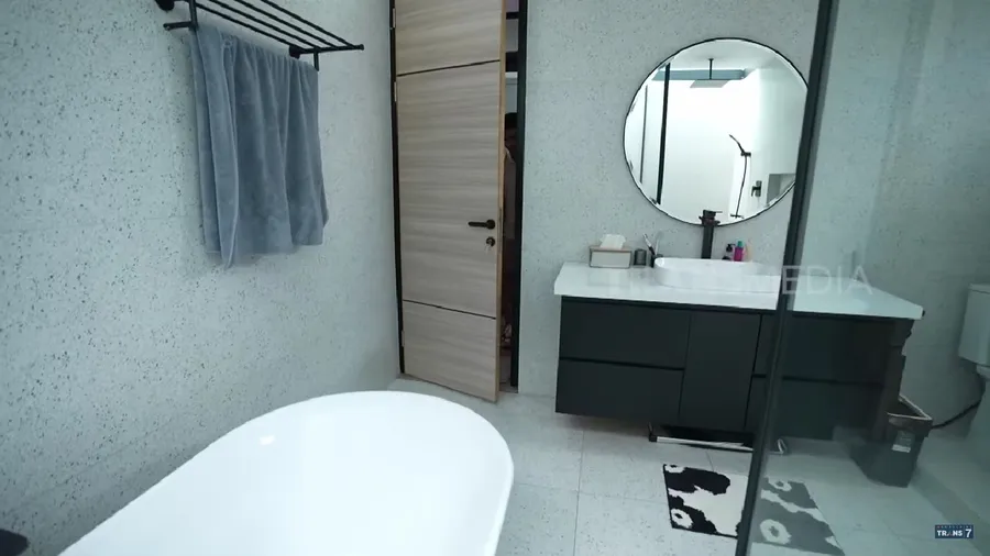 Kamar pribadi Tyas juga dilengkapi dengan kamar mandi. Di sini lah mereka berdua kerap mandi bersama. Ada wastafel, bathup, dan area shower.