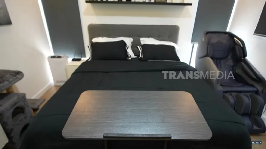Ini adalah penampakan kamar Tyas dan Tezi. Ada kasur yang cukup luas. Lagi-lagi warna gelap jadi pilihan untuk interior kamar. Penataan kamar Tyas terbilang simple.