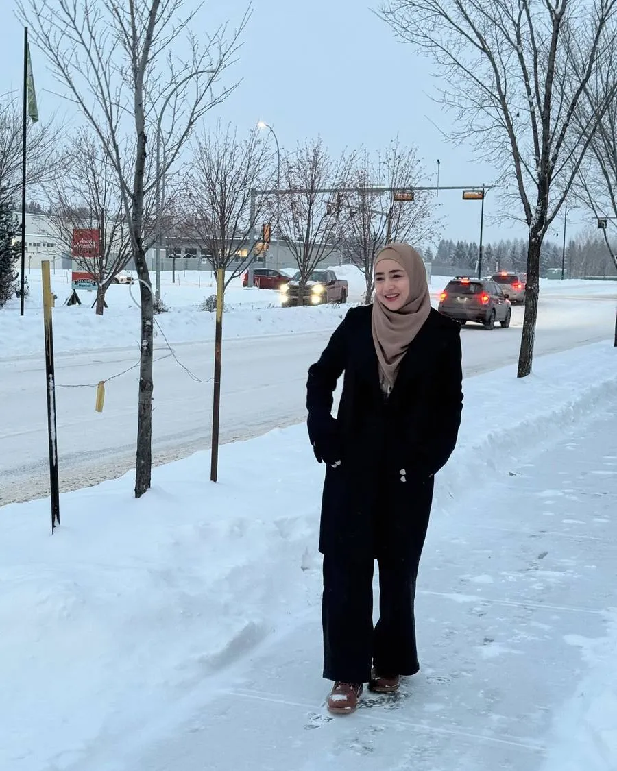 Cindy Fatika Sari tampak sangat menikmati musim dingin pertamanya di Kanada dengan berjalan-jalan di atas salju.