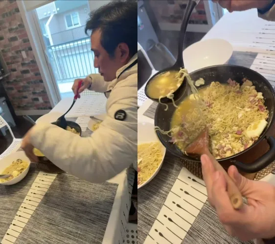 Sepulang dari belanja di supermarket, keluarga mereka makan mie kuah panas bersama di tengah cuaca yang menggigil. Nggak jauh beda sama kita-kita ya, KLovers?