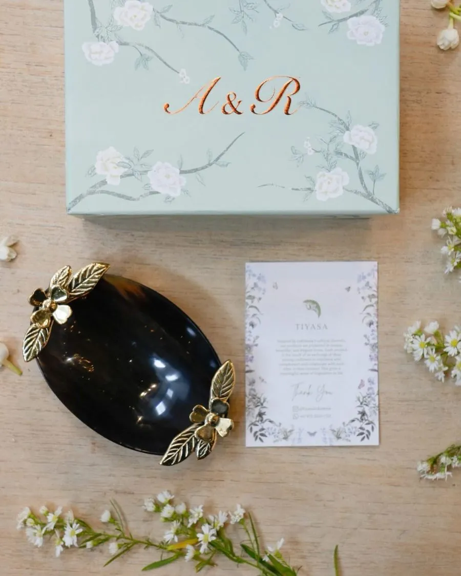 Potret souvenir pernikahan Rio & Athina disebut begitu elegan dan klasik. Terdapat inisial A & R di kotak souvenir tersebut.