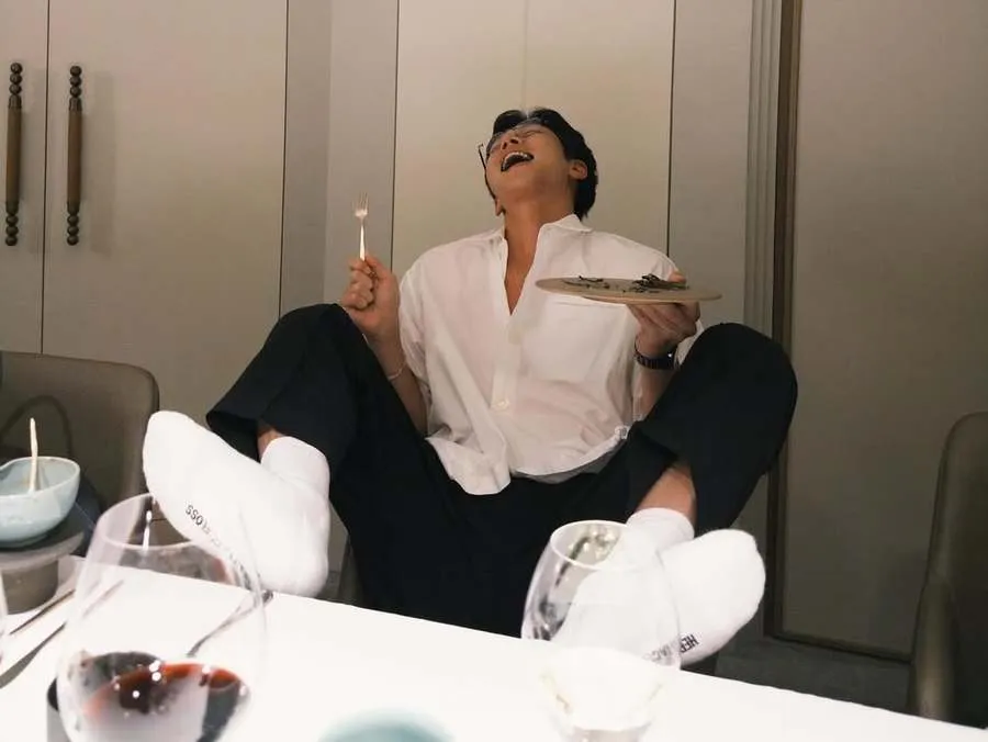 Suasana berubah menjadi lebih ceria dalam foto berikutnya. Ia duduk santai dengan kaki di atas kursi, menunjukkan kenyamanan luar biasa saat menikmati hidangan bersama orang-orang terdekat.