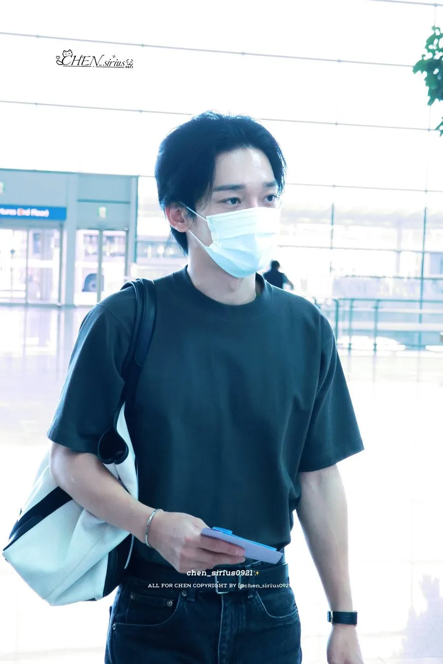 Begini penampilan Chen ketika berangkat ke Indonesia. Pakai kaos sederhana dan menutupi ketampanan dengan memakai masker.