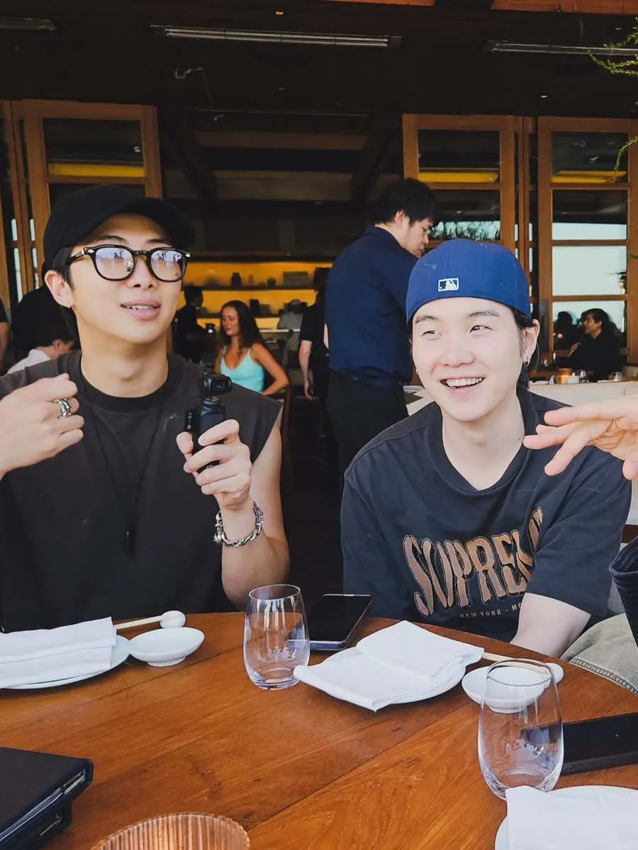 Suga dan RM BTS tampil dengan busana kasual dan topi. Keduanya berbincang santai saat nikmati waktu bersama di sebuah cafe.