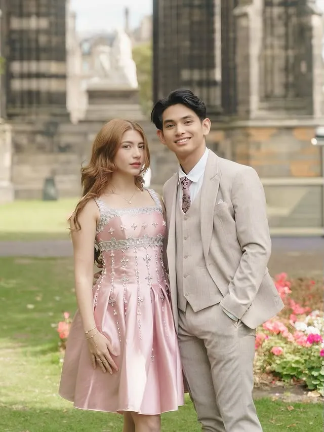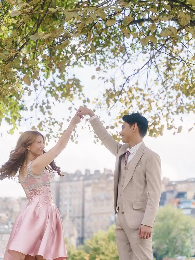 Cassandra Lee dan Ryuken Lie tampil bak pangeran dan tuan putri di Edinburgh. Cassandra mengenakan gaun merah muda, sedangkan Ryuken memakai setelan jas krem.