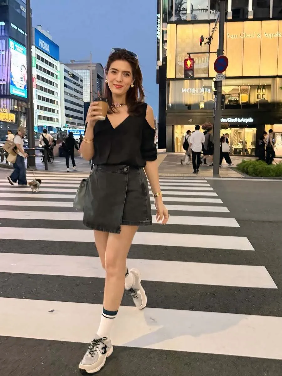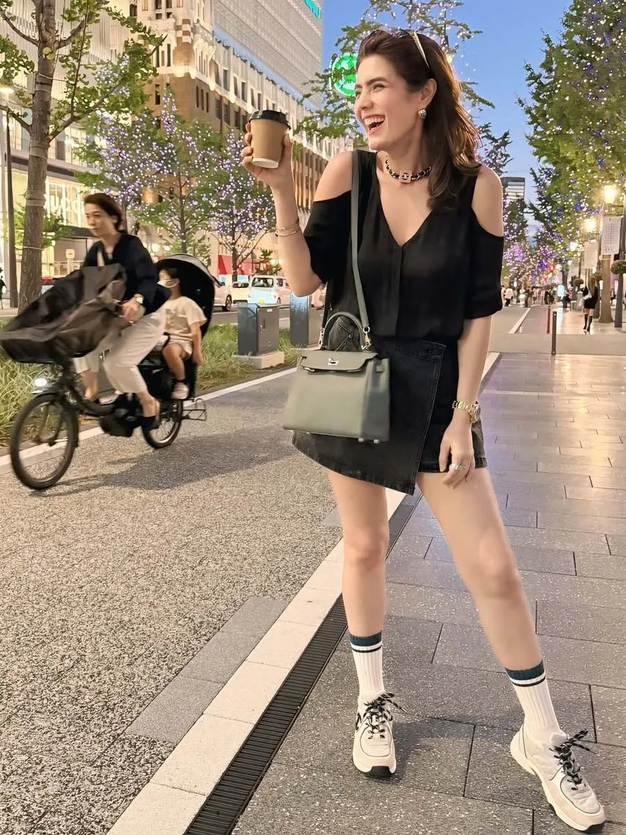 Namun penampilannya masih bak remaja masa kini. Atasan dengan aksen terbuka di bahu dipadu dengan bawahan pendek membuatnya tampak jauh lebih muda.