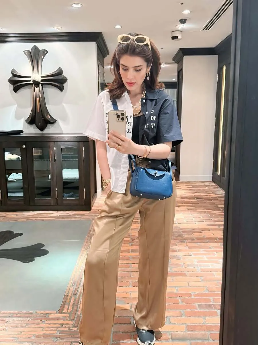 Di momen yang lain, Carissa terlihat santai kenakan busana yang lebih longgar. Atasannya bernuansa two tone sementara celana warna cokelat muda mempermanis penampilannya.