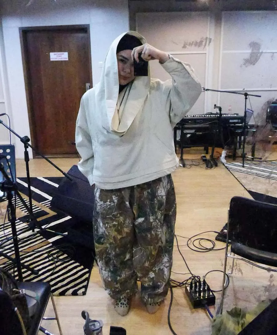 Dalam salah satu penampilan, Sivia terlihat memukau dengan gaya yang tetap ekspresif. Ia mengenakan hijab yang dililit seperti turban, dipadukan dengan abaya patchwork warna-warni yang menonjolkan sisi artistiknya.