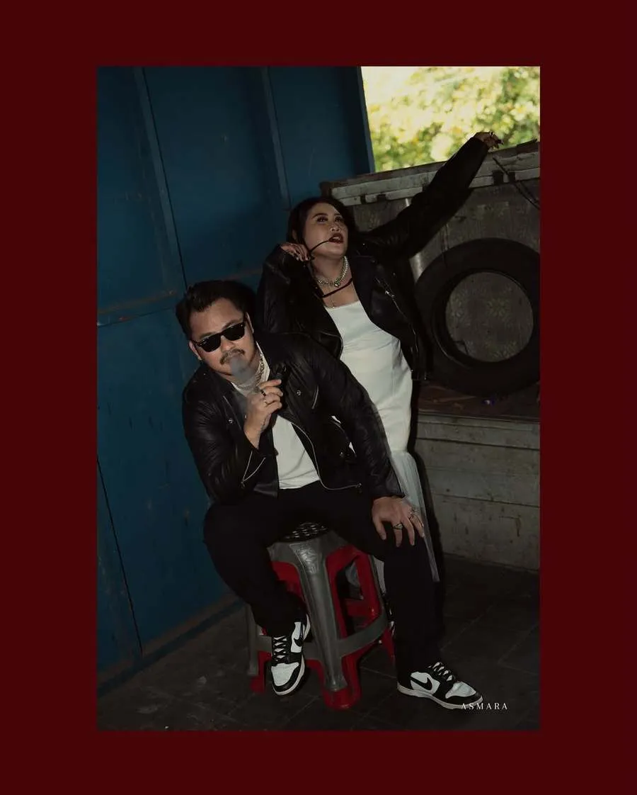 Suasana foto terasa santai, playful, dan sangat street style. Boiyen dan Rully kompak pakai jaket kulit hitam.