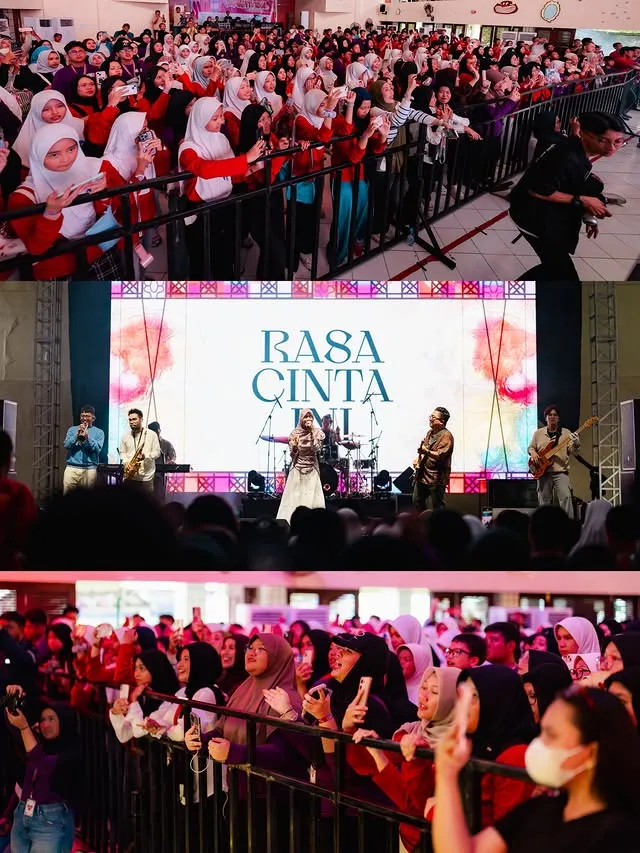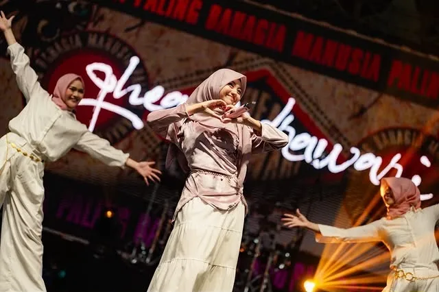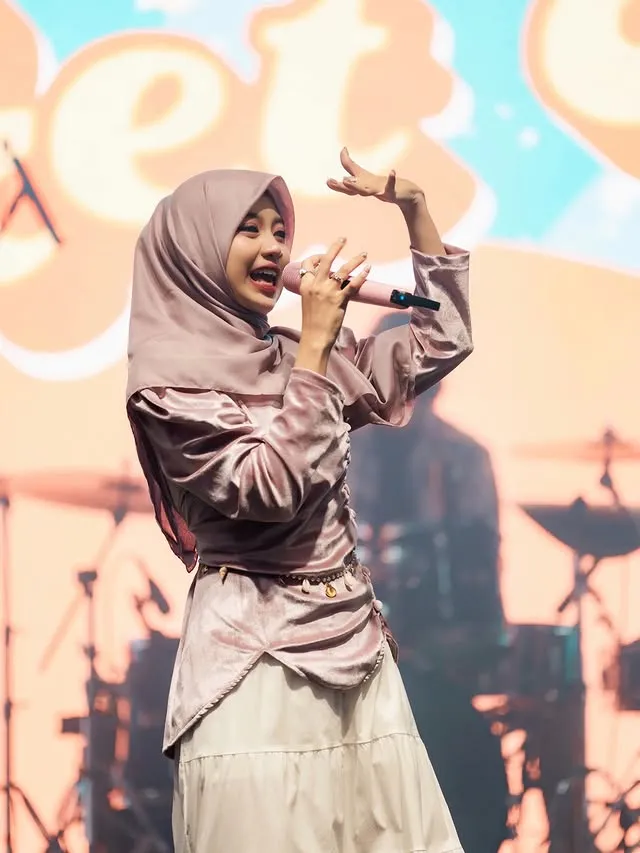 Penampilan Ghea Indrawari dengan hijab di panggung memancarkan aura yang meneduhkan. Busana muslimah berwarna lembut itu sangat cocok dengan karakter suaranya yang merdu.