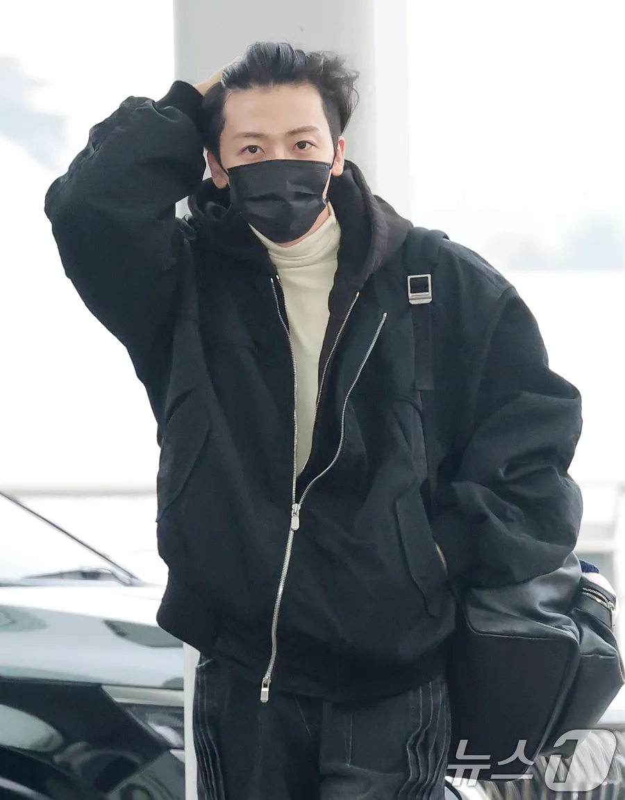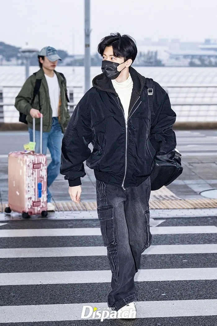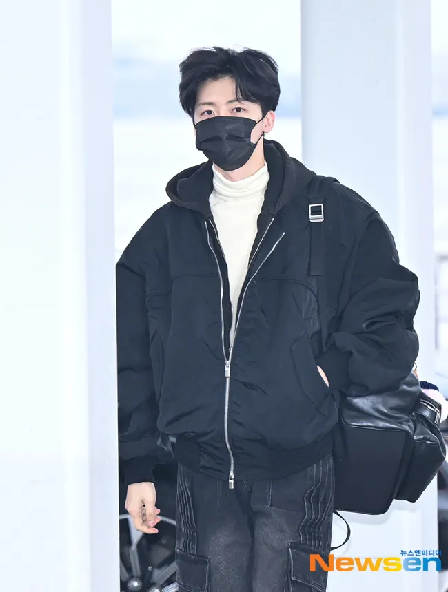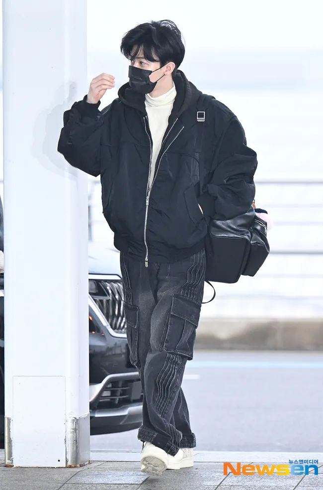 Jaemin tiba di bandara mengenakan jaket hitam oversized dipadukan dengan inner turtleneck warna krem. Kombinasi ini terlihat clean, hangat, dan stylish.