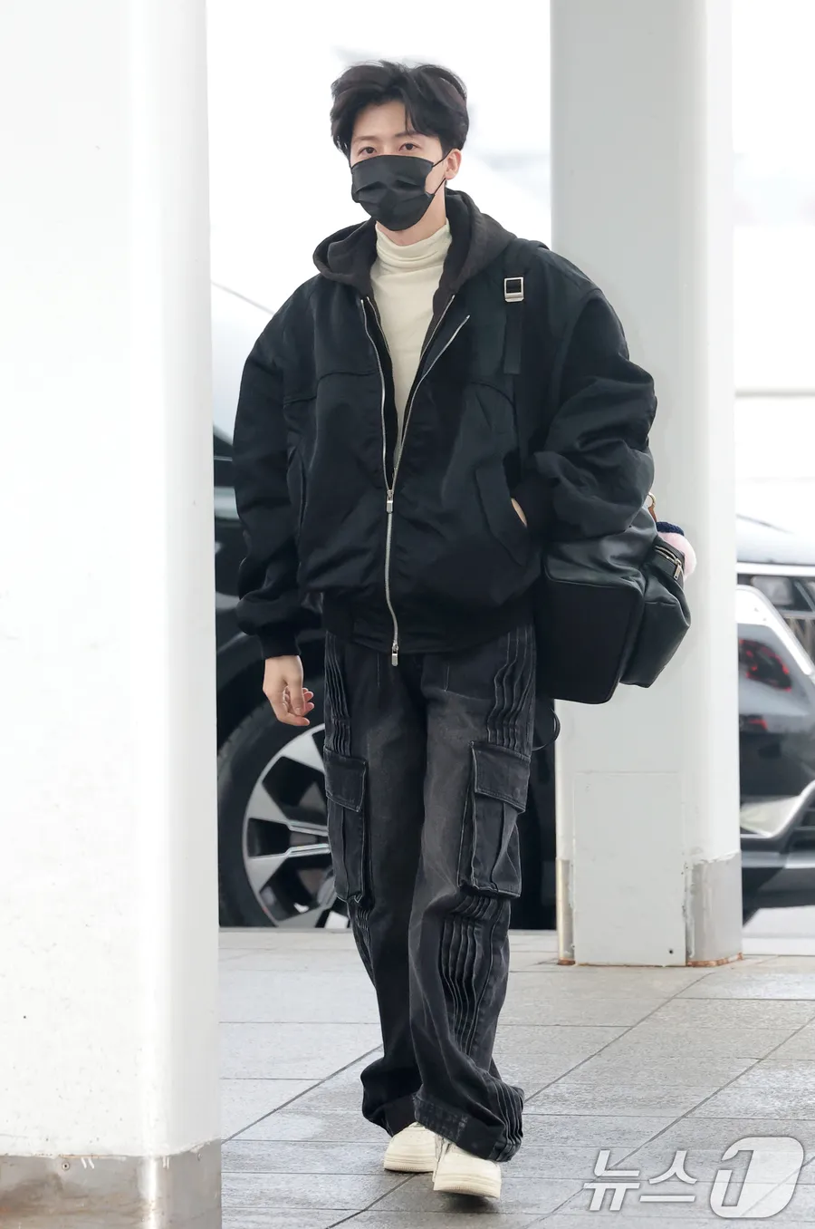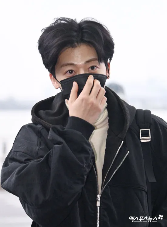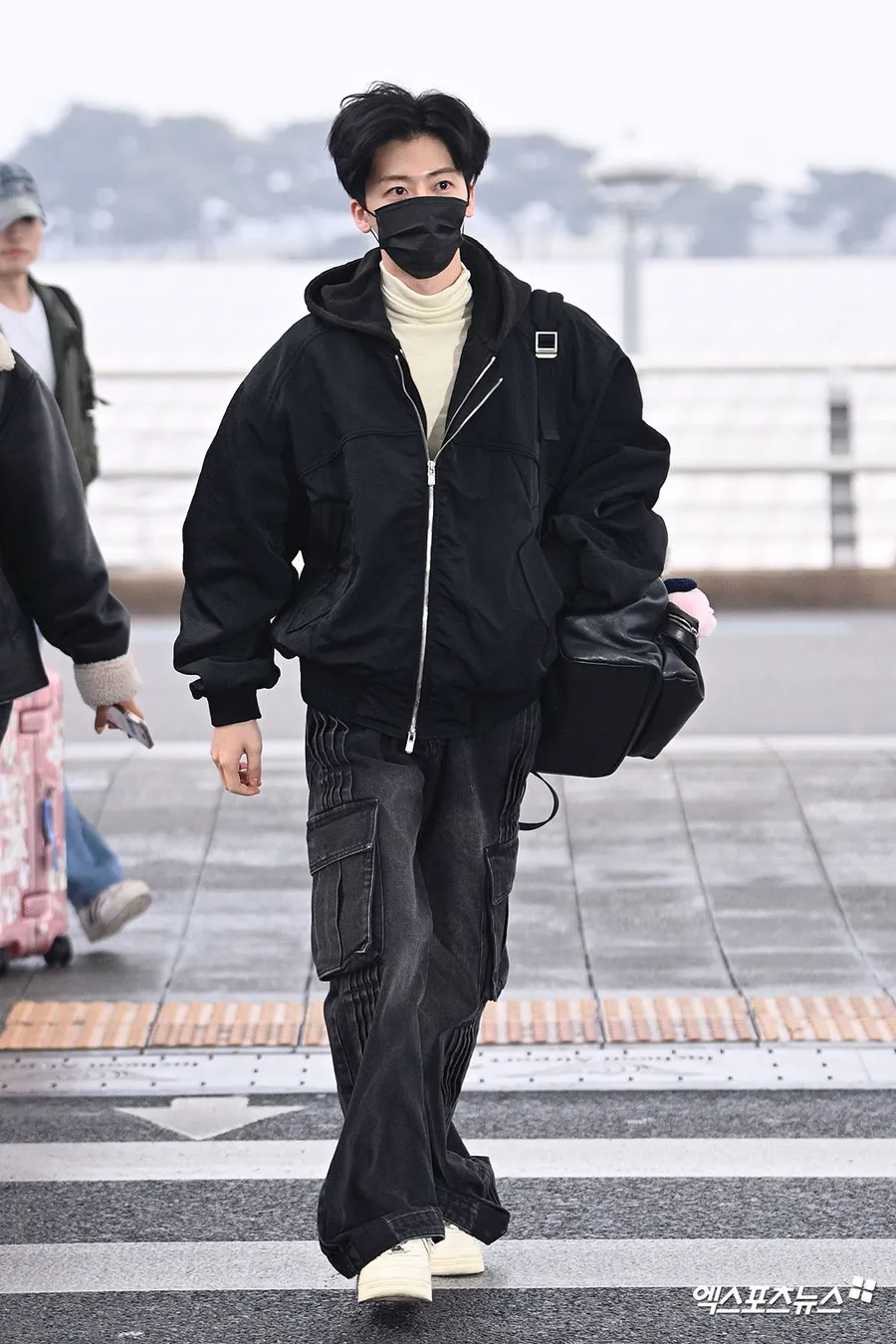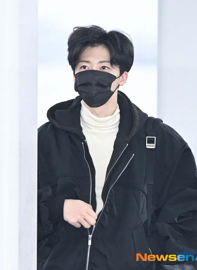 Jaemin tiba di bandara mengenakan jaket hitam oversized dipadukan dengan inner turtleneck warna krem. Kombinasi ini terlihat clean, hangat, dan stylish.