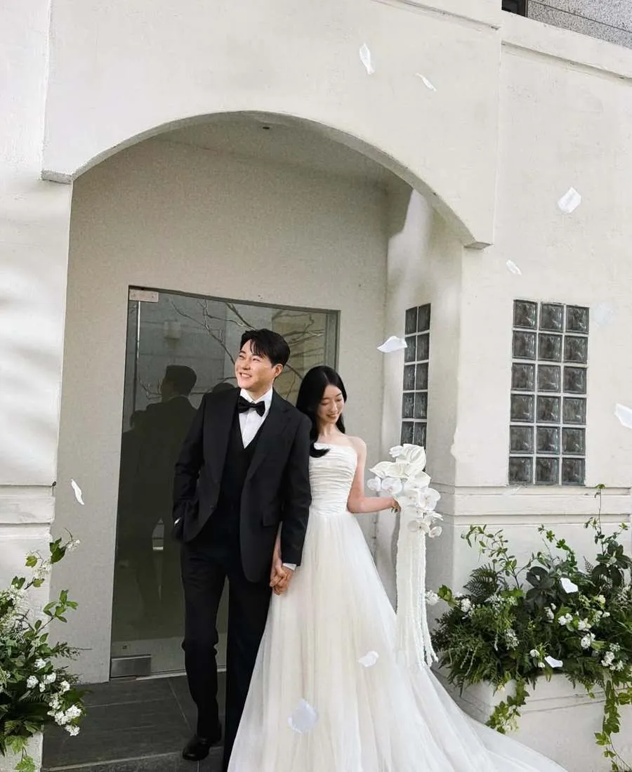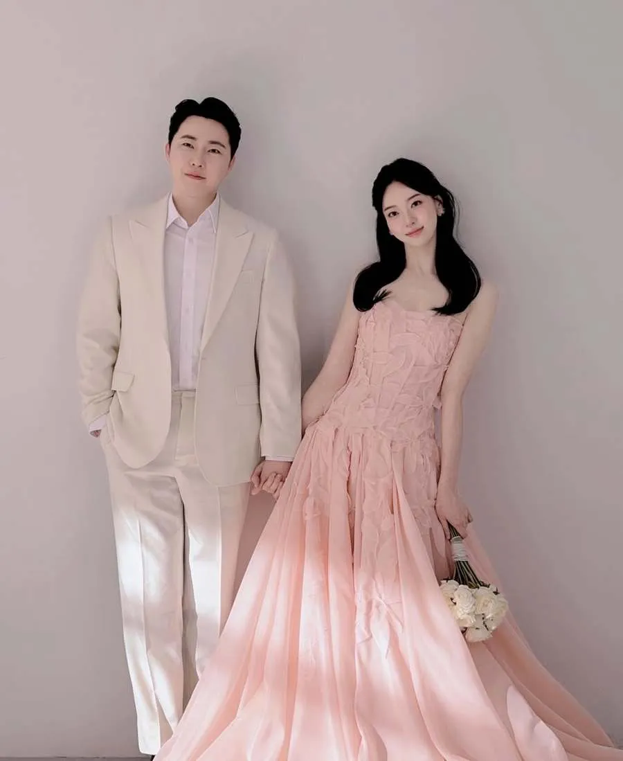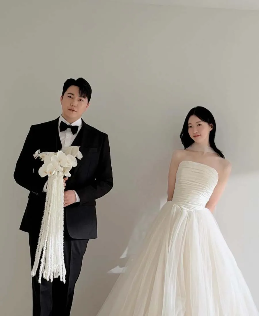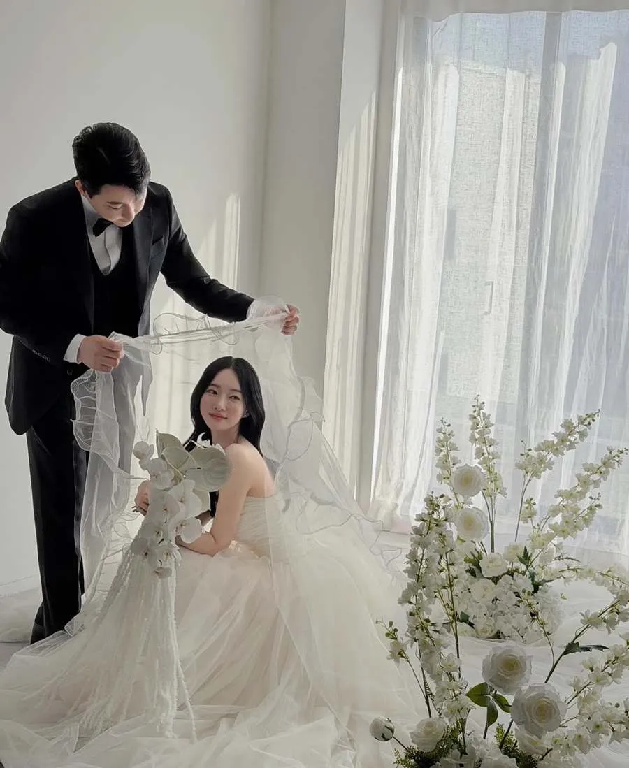 Dalam foto prewedding-nya, Kim Yu Ji tampil anggun dengan gaun putih klasik, sementara calon suaminya mengenakan tuxedo rapi dengan postur tegap yang mencuri perhatian.