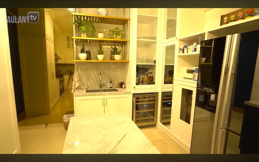 Ini adalah dapur rumah Luna Maya yang mewah dan modern. Ruangan yang didominasi warna putih ini membuat kesan yang clean banget.