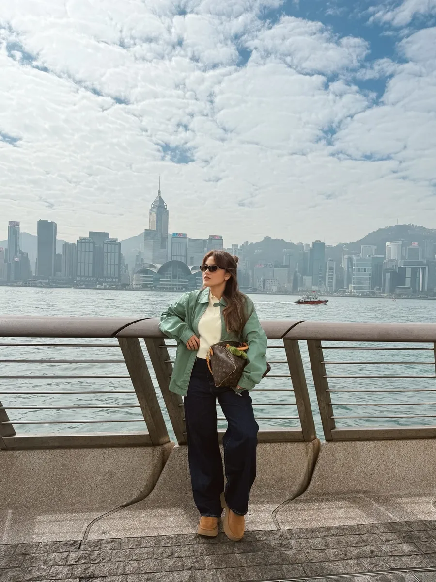 Marsha Aruan tampak sangat menikmati momen liburan ke Hongkong. Marsha berfoto di salah satu kawasan pesisir dengan pemandangan gedung pencakar langit Hongkong yang megah dan indah.