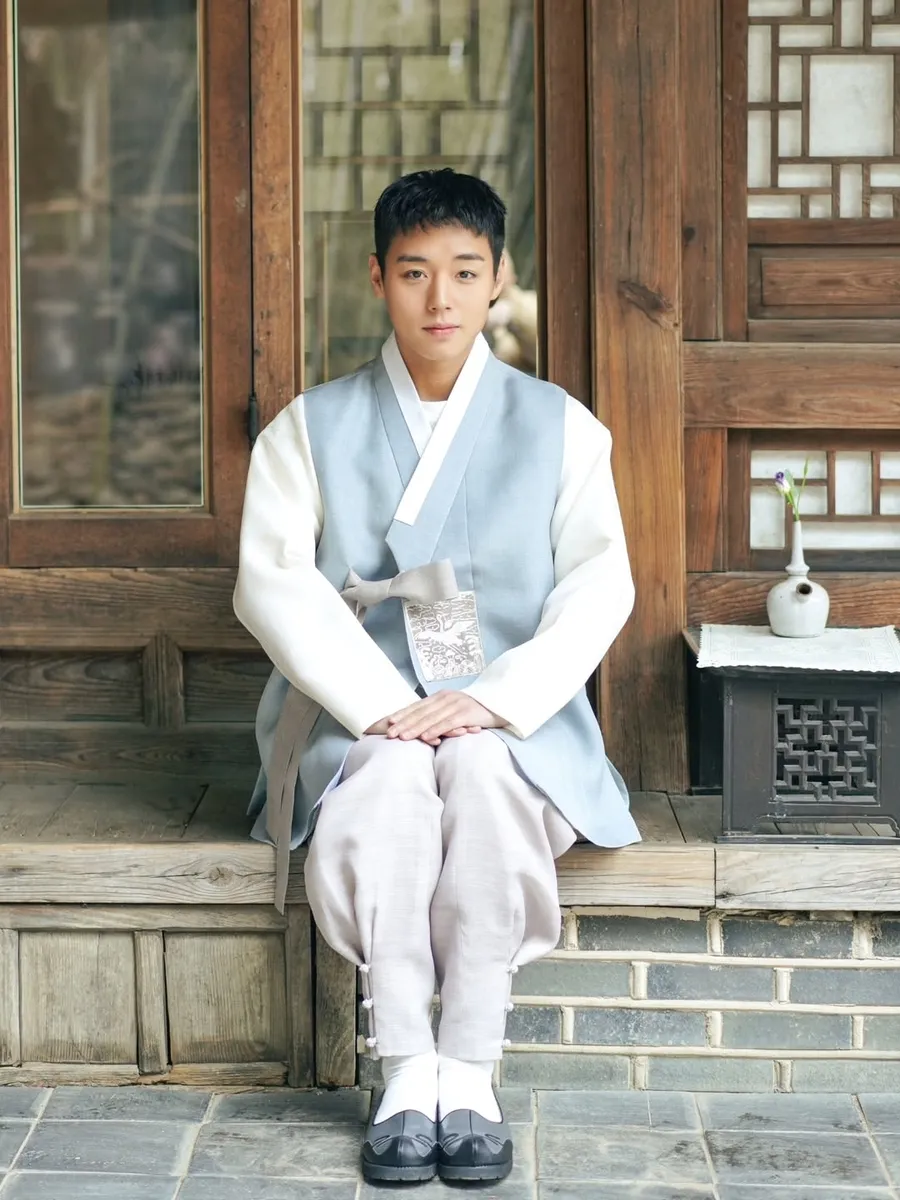 Jeogori putih polos dipadukan rompi biru muda dengan potongan rapi, memberi siluet simpel tapi tetap berwibawa khas bangsawan era Joseon.