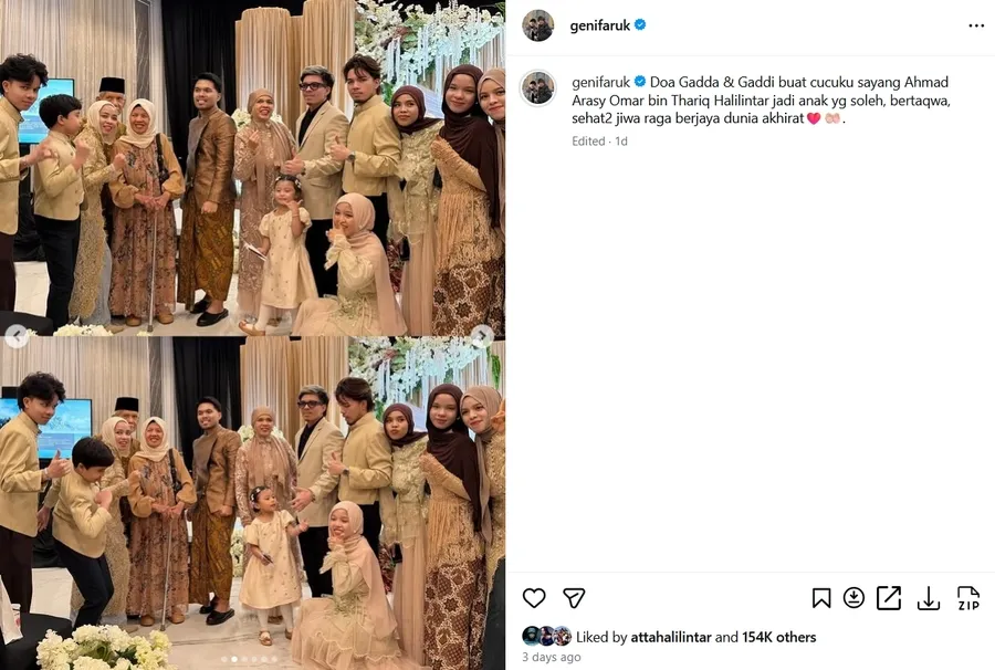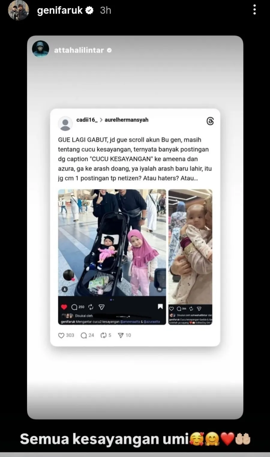 Tidak hanya itu, Geni juga mengunggah ulang story yang diposting oleh Atta Halilintar. Ia menyebut bahwa semua cucu ia sayangi, tanpa terkecuali, bukan hanya sayang Arash saja.