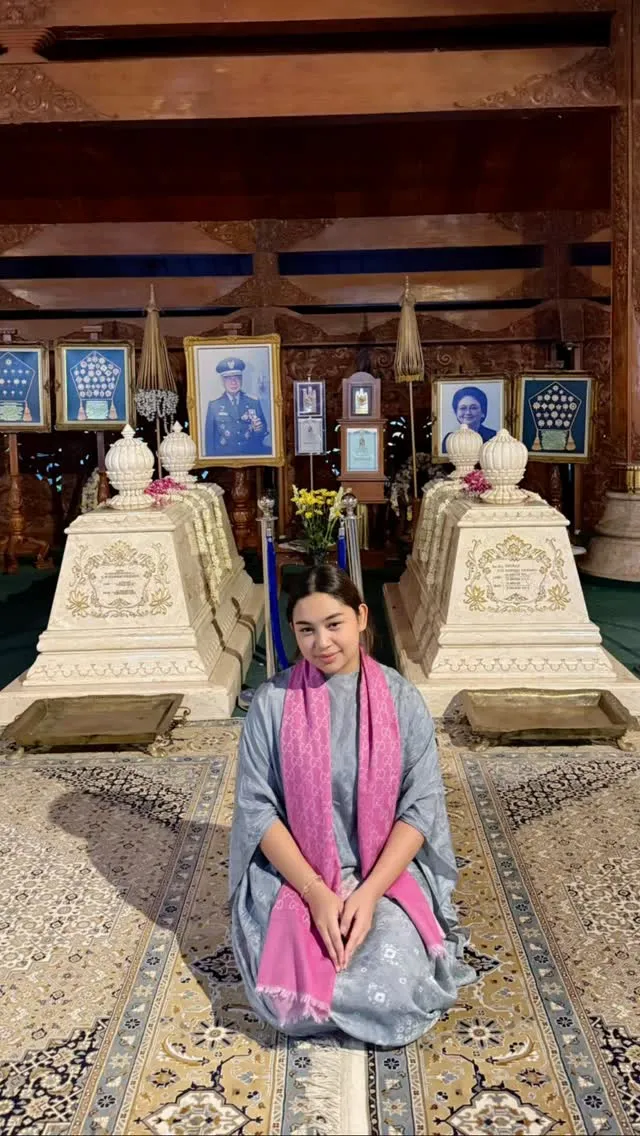 Khirani juga difoto ketika sedang duduk di antara pusara kakek neneknya. Penampilannya sederhan dengan selendang pink berada di lehernya.