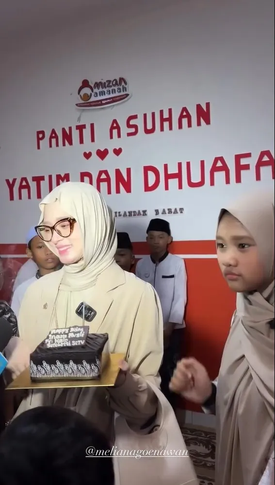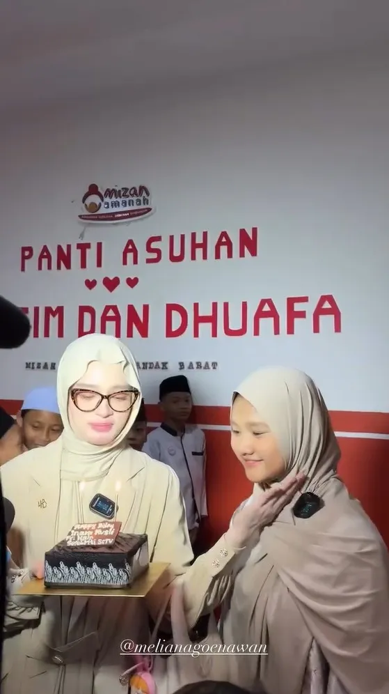 Ditemani anak sulungnya, Starla, Inara membawa kue tart ulang tahun di tangannya. Ibu tiga anak itu tampak merayakan bertambahnya usia di panti asuhan anak yatim dan dhuafa.