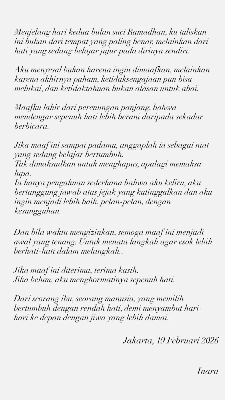 Dalam unggahan IG story, Inara menyematkan permintaan maaf terbuka. Ia membuka surat dengan menegaskan bahwa tulisan ini bukan berasal dari posisi paling benar, melainkan dari hati yang sedang belajar jujur pada diri sendiri. Ia menegaskan bahwa penyesalannya bukan karena ingin dimaafkan.