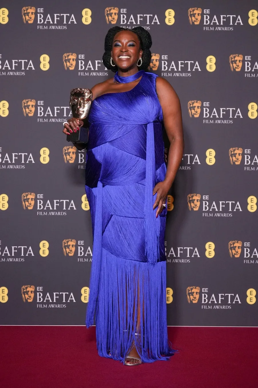 Peraih Best Supporting Actress untuk Sinners, Wunmi Mosaku, mengenakan layered dress biru berkilau rancangan Ahluwalia. Gaunnya yang kontras dengan karpet merah tampak memantulkan cahaya dengan indah.