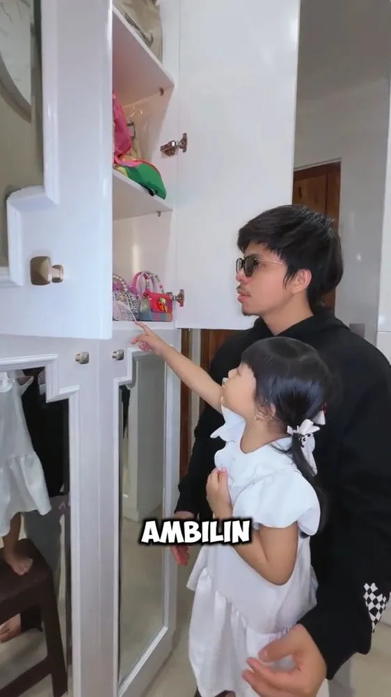 Bukan hanya lemari pakaian, Ameena juga memperlihatkan koleksi tasnya di sebuah lemari khusus yang juga berwarna putih glossy. Ameena terlihat mendongak bersama ayahnya sambil memilah tas mana yang ingin diambil.