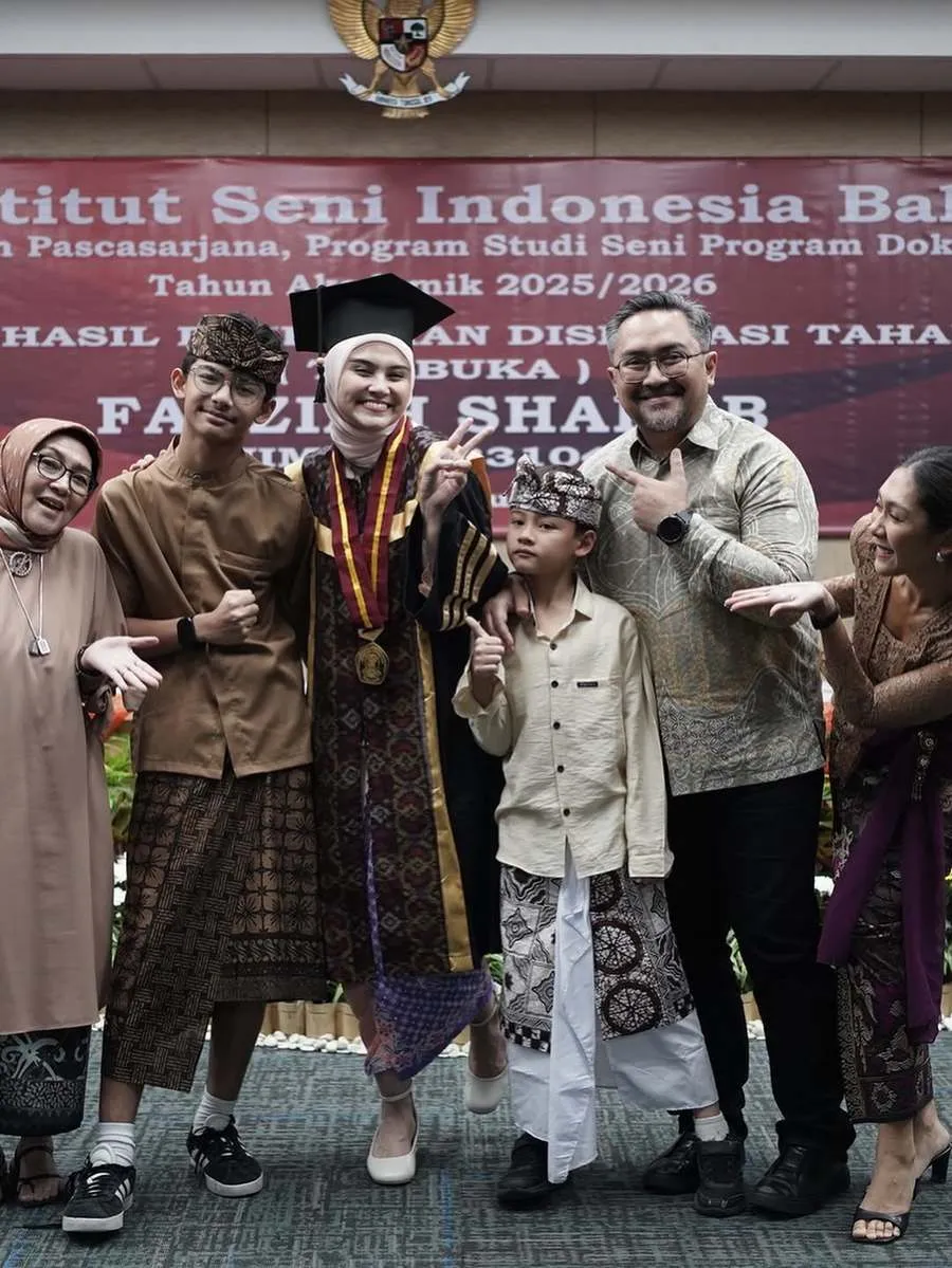 Kebahagiaan Zee Zee Shahab kian lengkap berkat kehadiran keluarga tercinta di momen wisuda S-3 miliknya. Mereka tampil sangat kompak dan memancarkan rona bangga atas pencapaian gelar doktor tersebut.