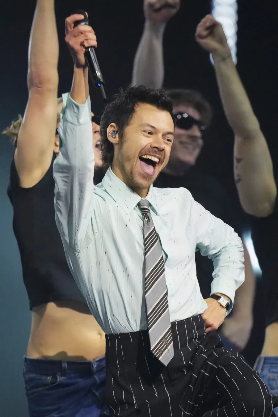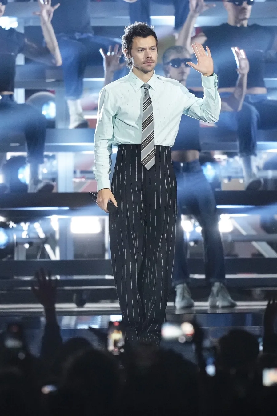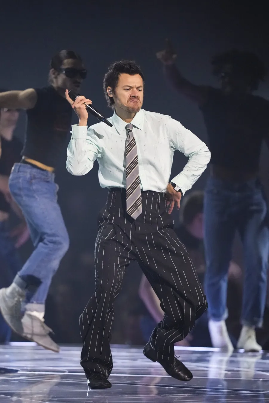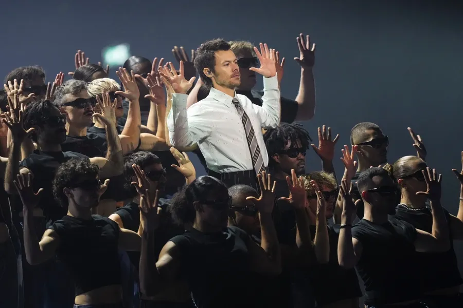 Ketika tampil di panggung, Harry melepaskan jas hitamnya. Ia juga mengganti sepatu balet yang sebelumnya dipakai di red carpet dengan sepatu pantofel hitam bergaya formal.