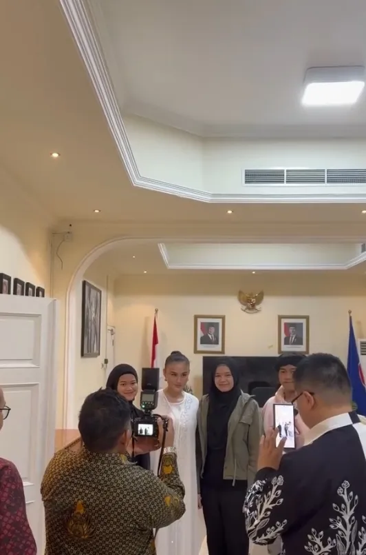 Kedatangan Agnez di KJRI Dubai disambut hangat oleh para diplomat yang bertugas di sana. Para pegawai di KJRI sudah berdiri di depan gedung, menyambut Agnez yang datang bersama timnya.