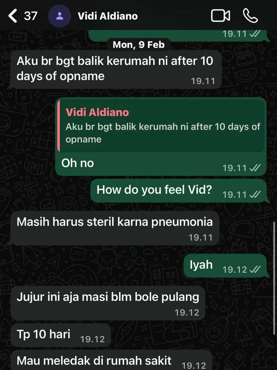 Lewat unggahan di Instagram pribadinya, Daniel mengungkap percakapan terakhirnya dengan Vidi via chat WA. Terungkap betapa Vidi terkena pneumonia dan harus opname.