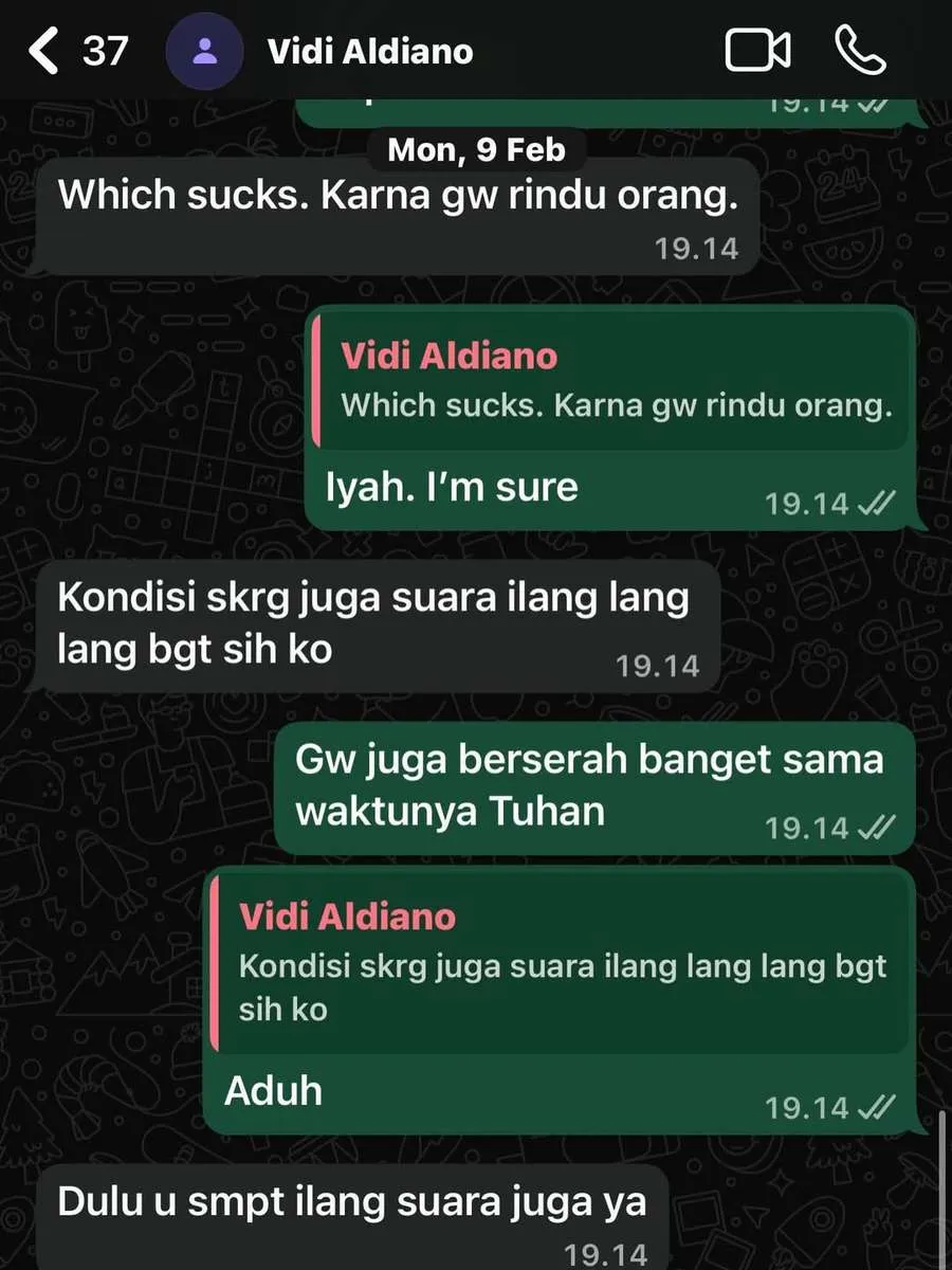 Lebih lanjut, Vidi juga menyebut suaranya sudah hilang. "Kondisi sekarang juga suara ilang lang lang banget sih, ko. Dulu you sempet ilang suara juga ya," tulis Vidi.