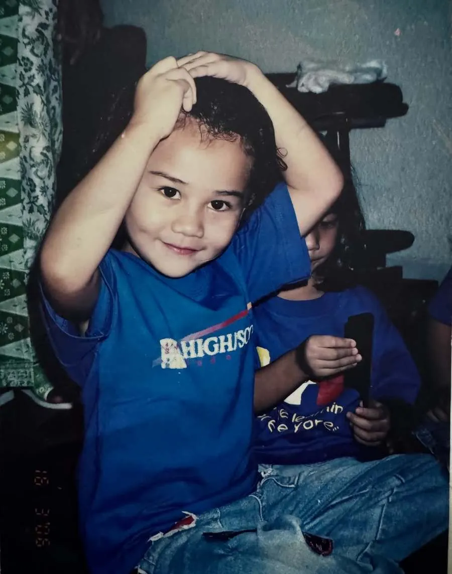 Di foto masa kanak-kanak, Aaliyah Massaid terlihat memiliki rambut ikal yang menjadi ciri khasnya. Ia bermain santai sambil merapikan rambutnya dengan ekspresi manis.