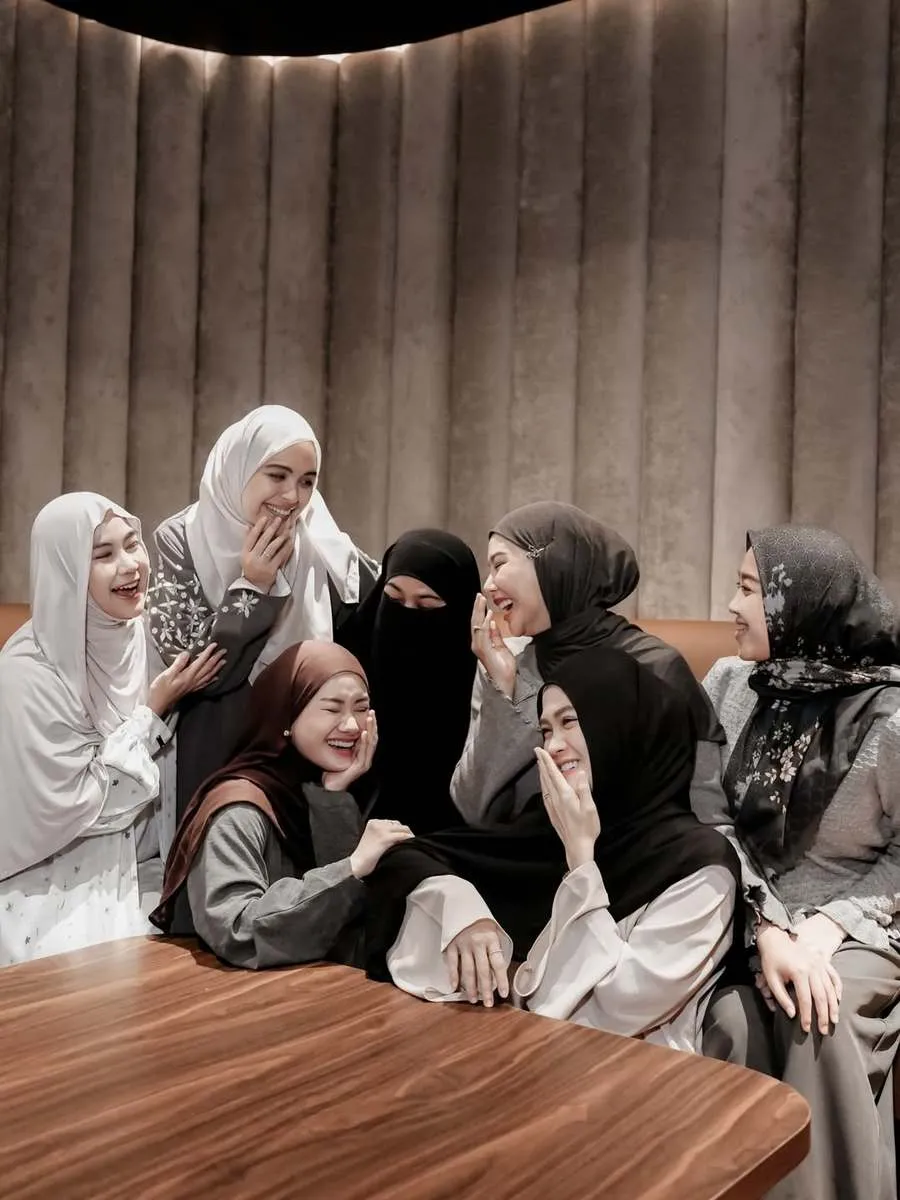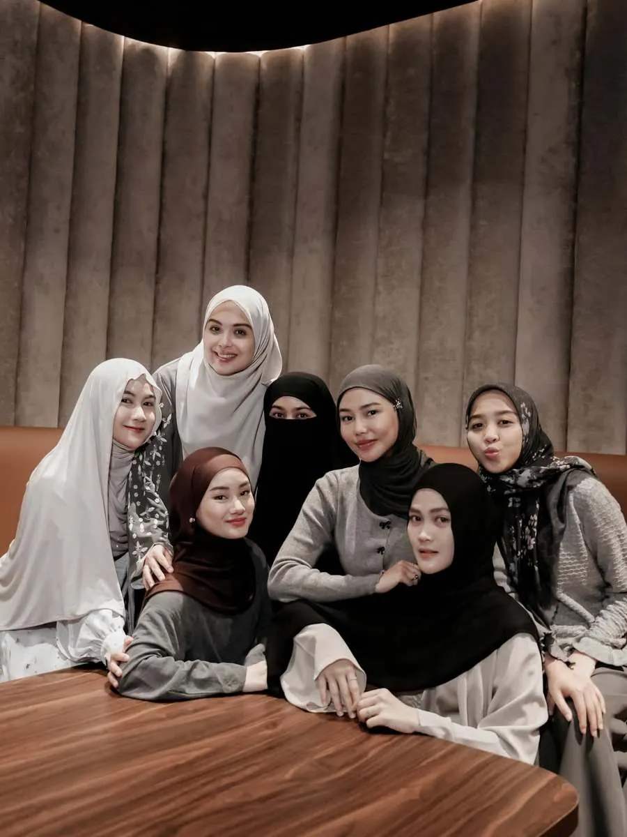 Dinda Hauw terlihat anggun mengenakan jilbab cokelat tua dengan busana bernuansa abu-abu. Penampilannya tampak sederhana namun tetap elegan di tengah sahabat-sahabatnya.