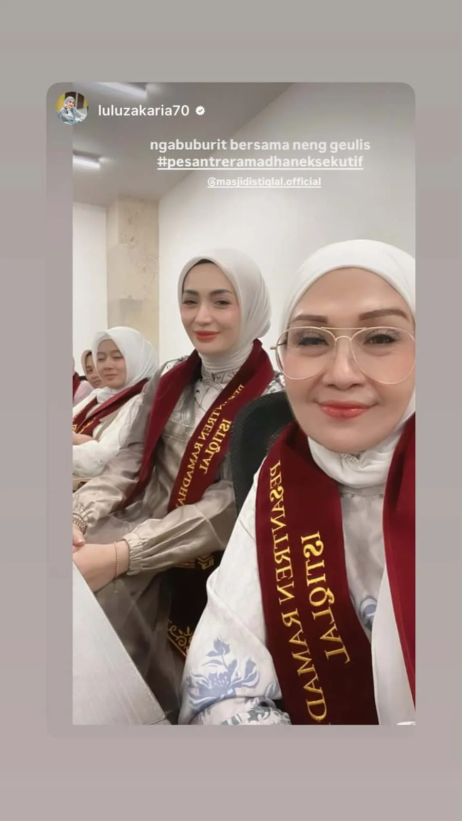 Imel Putri Cahyati membagikan aktivitasnya saat mengikuti kegiatan Pesantren Ramadan eksekutif di Masjid Istiqlal, Jakarta. Dalam momen itu, sang artis terlihat mengenakan gamis berwarna abu-abu. Ia juga memakai selempang marun bertuliskan Pesantren Eksekutif.
