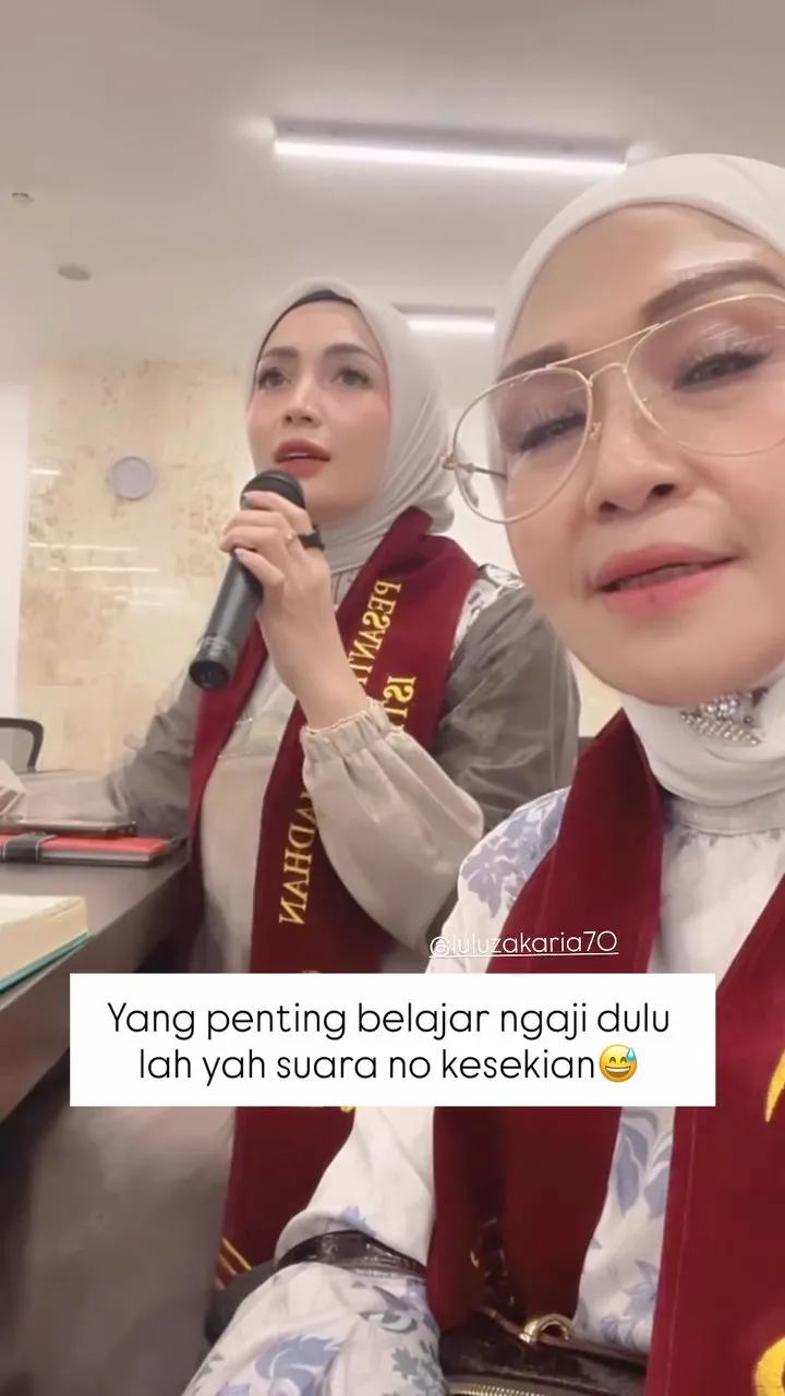 Di depan mereka terlihat buku dan perlengkapan belajar. Kegiatan ini menjadi bagian dari sesi pembelajaran, bahkan sang artis melantunkan bacaan mengaji dihadapan para peserta dan ustaz.
